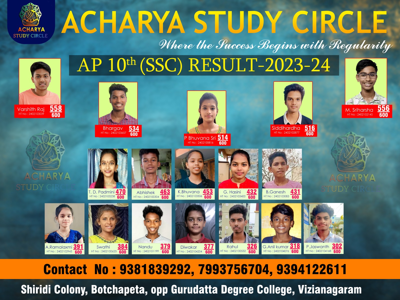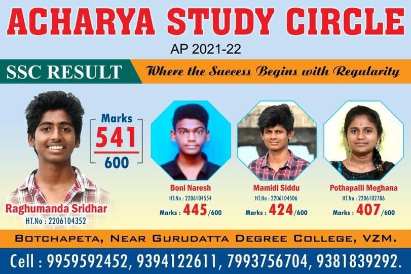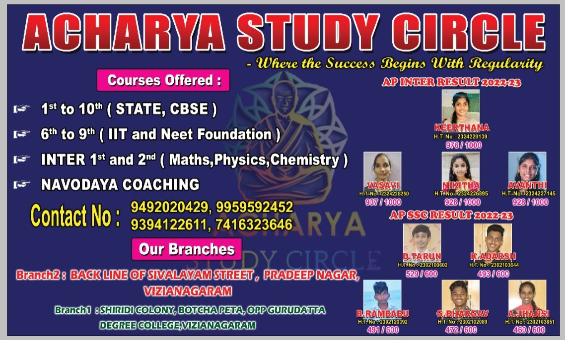 Acharya Study Circle is one of the best educational institute dedicated to empowering students with quality learning and academic excellence. Established to provide top-tier education, we have grown into a trusted institution in Vizianagaram, offering a structured and personalized learning experience. With a strong focus on student success, we specialize in comprehensive coaching, exam preparation, and skill development. Our institute ensures a well-rounded approach, guiding students from foundational learning to advanced concepts, all while providing personalized attention to help them achieve their academic goals.